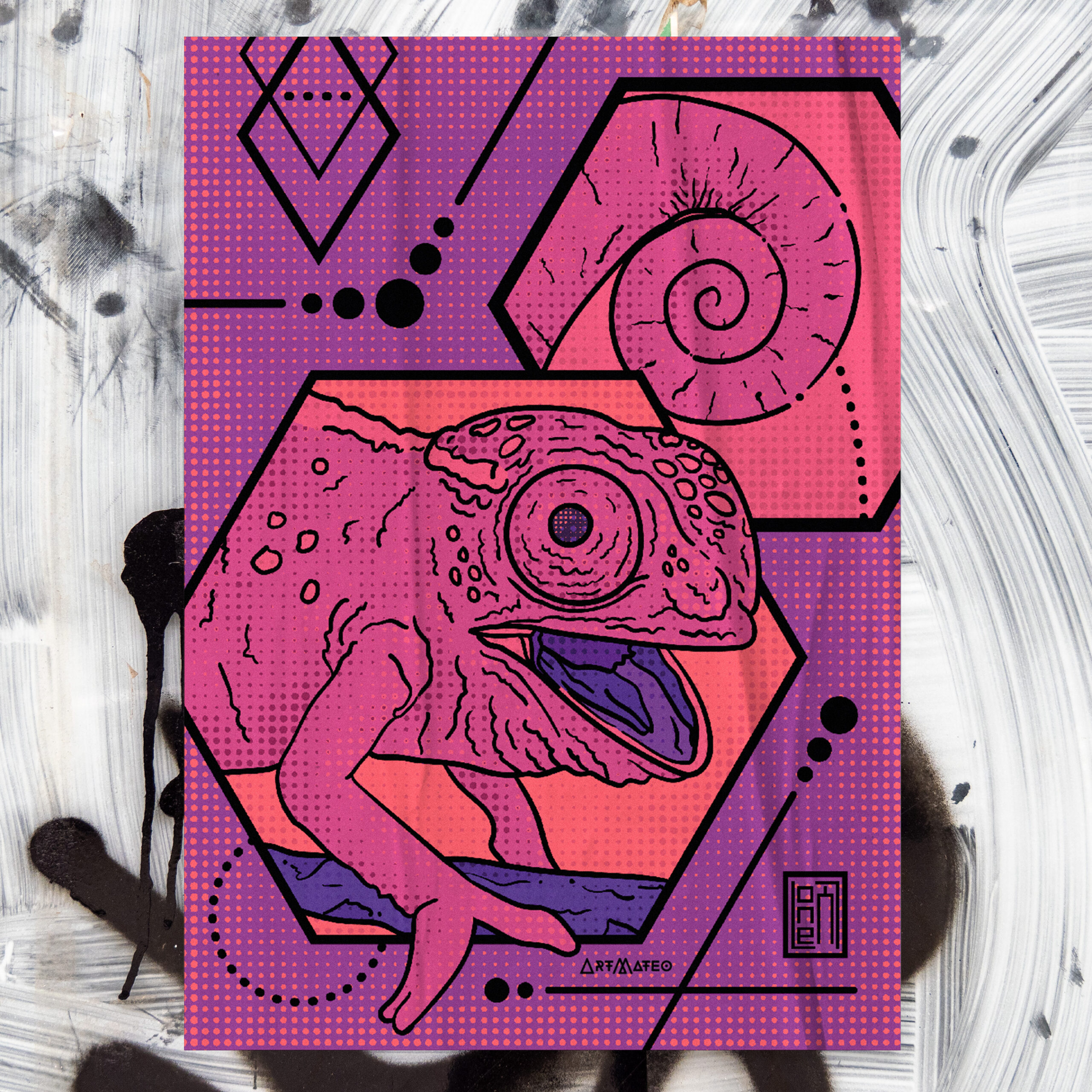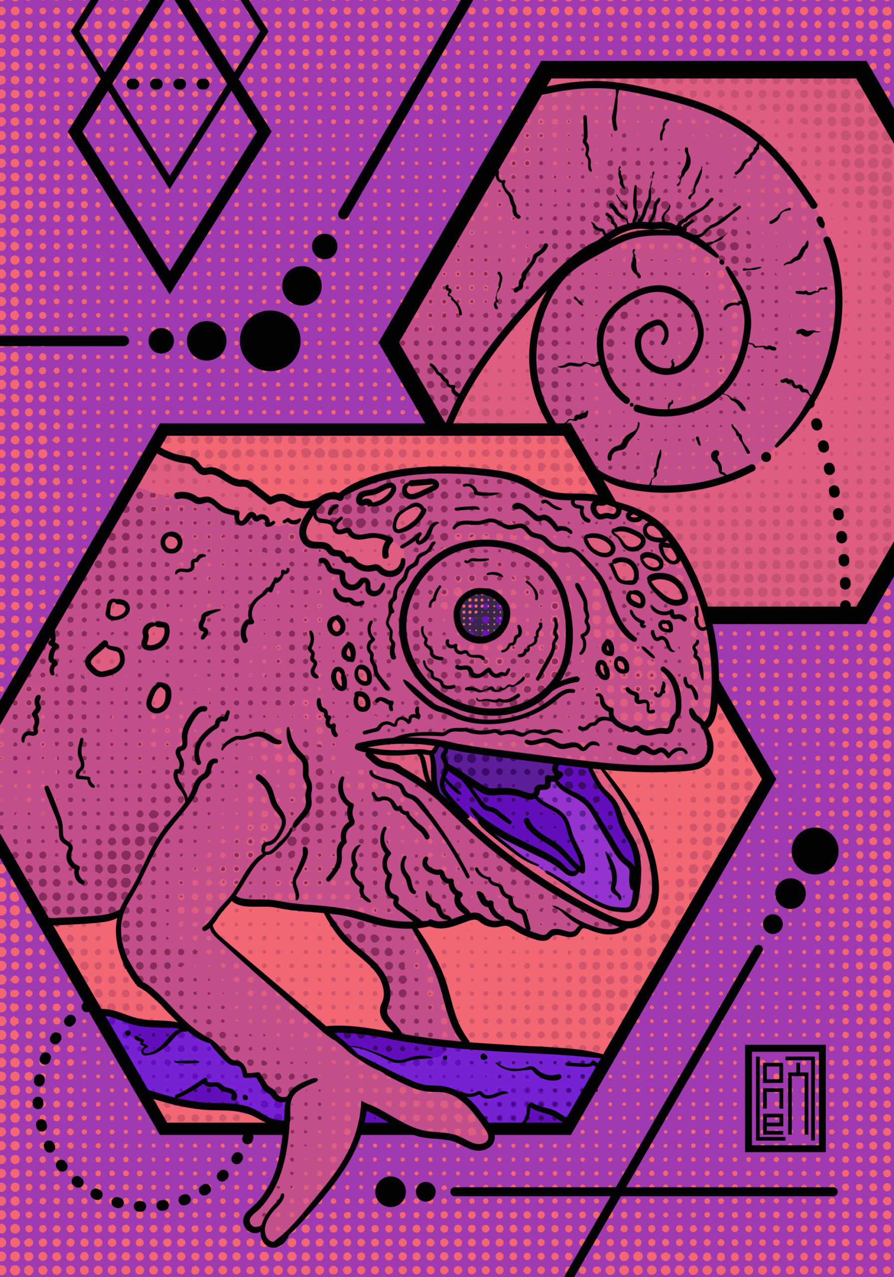 Ilustraciones generadas sobre diversos animales, con composición entre geométrica y estilo dibujo.