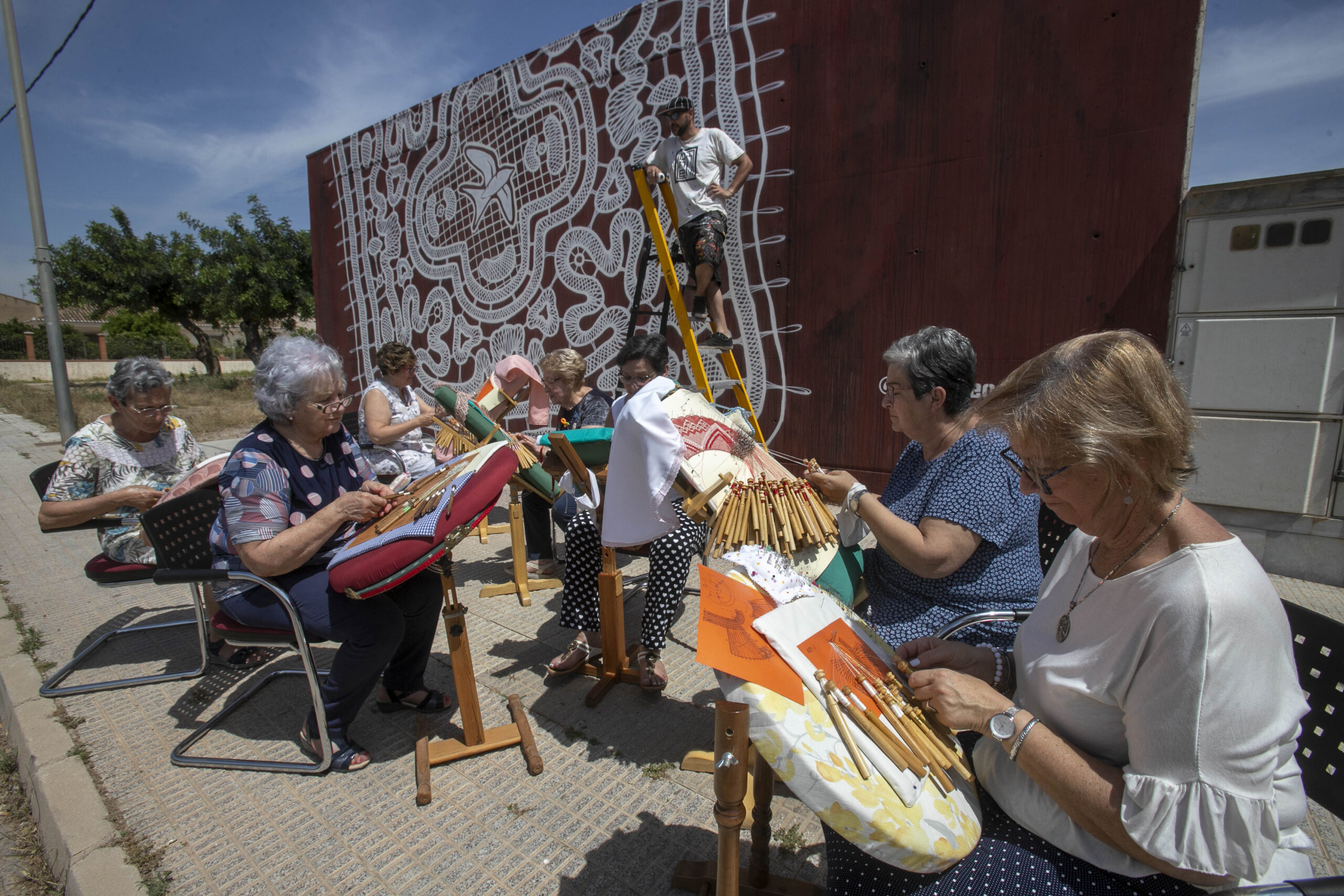 Se rinde homenaje a la técnica artesanal del encaje de bolillos, que por desgracia no está teniendo un cambio generacional y acabará por perderse como otras tantas artesanías. La obra se plantea como una amalgama de líneas que no dejan de cruzarse, hasta dar forma a una representación gigante de un mantel de bolillo, que descansa sobre la pared del Museo dedicado a este arte.