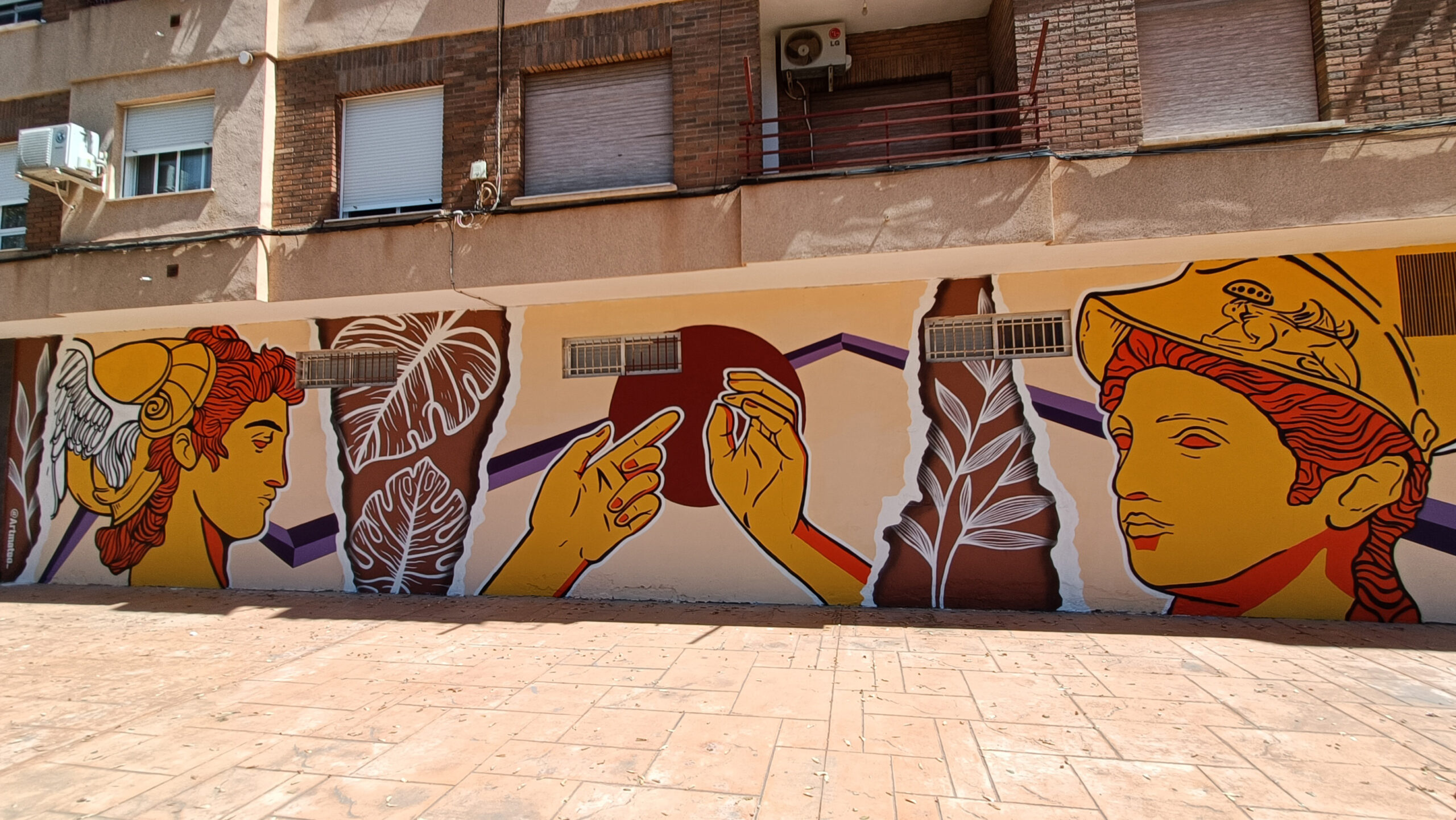 Mural dedicado a esa dualidad que nos enfrentamos los emprendedores. Hermes, dios del comercio junto a Atenea, diosa de la guerra Representados ambos en busca de un equilibrio. El cual no siempre se encuentra en un punto intermedio. ¿Qué somos? Me pregunto en más ocasiones de las que me gustaría. Pues unos días me hacen levantarme con espada defendiendo mi pasión. y otros me siento un punto de encuentro donde la búsqueda es mi creación.